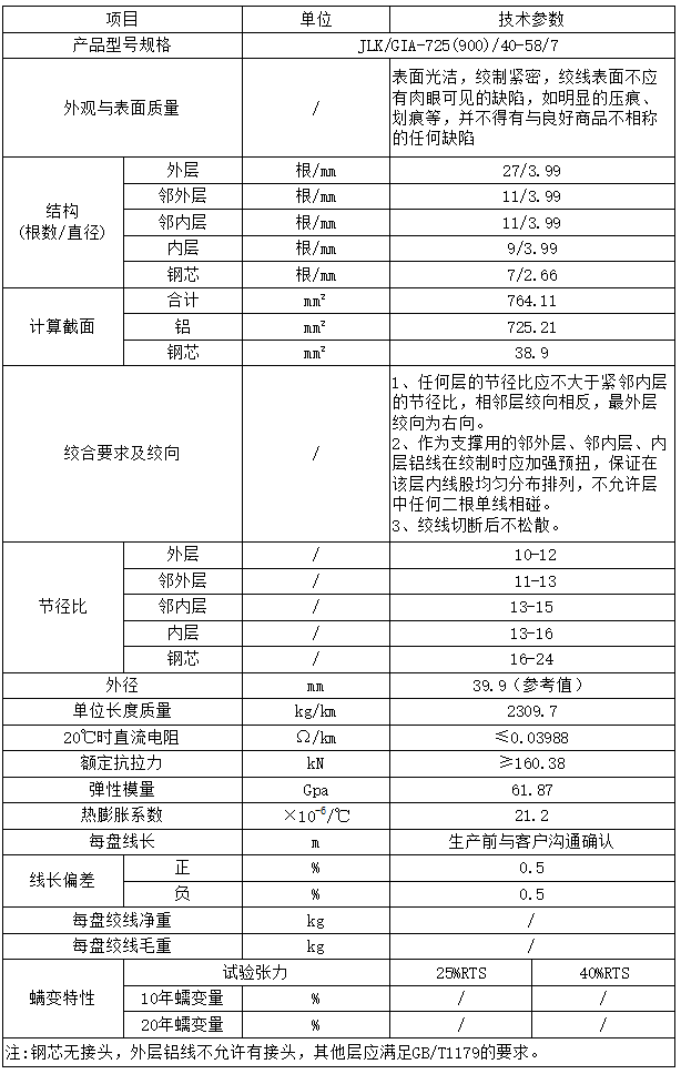 JLK/G1A-725(900)/40-58/7擴(kuò)徑導(dǎo)線技術(shù)參數(shù)表